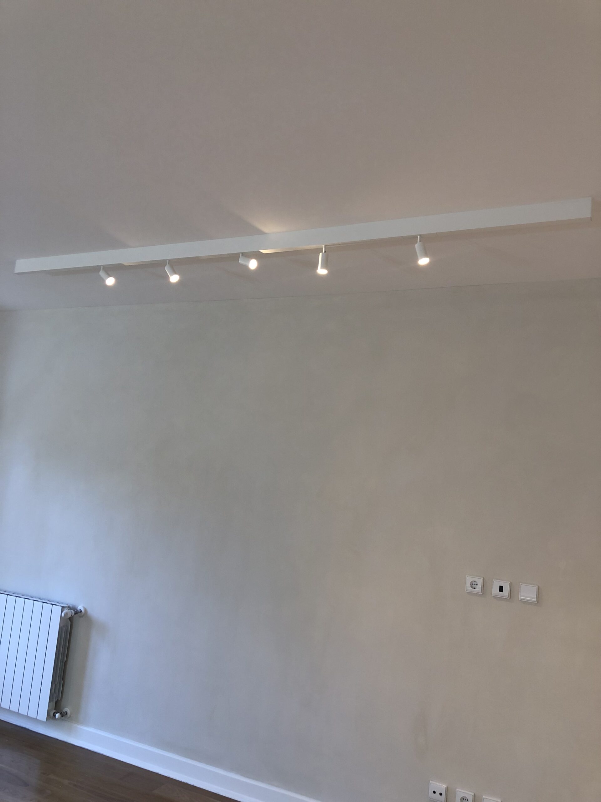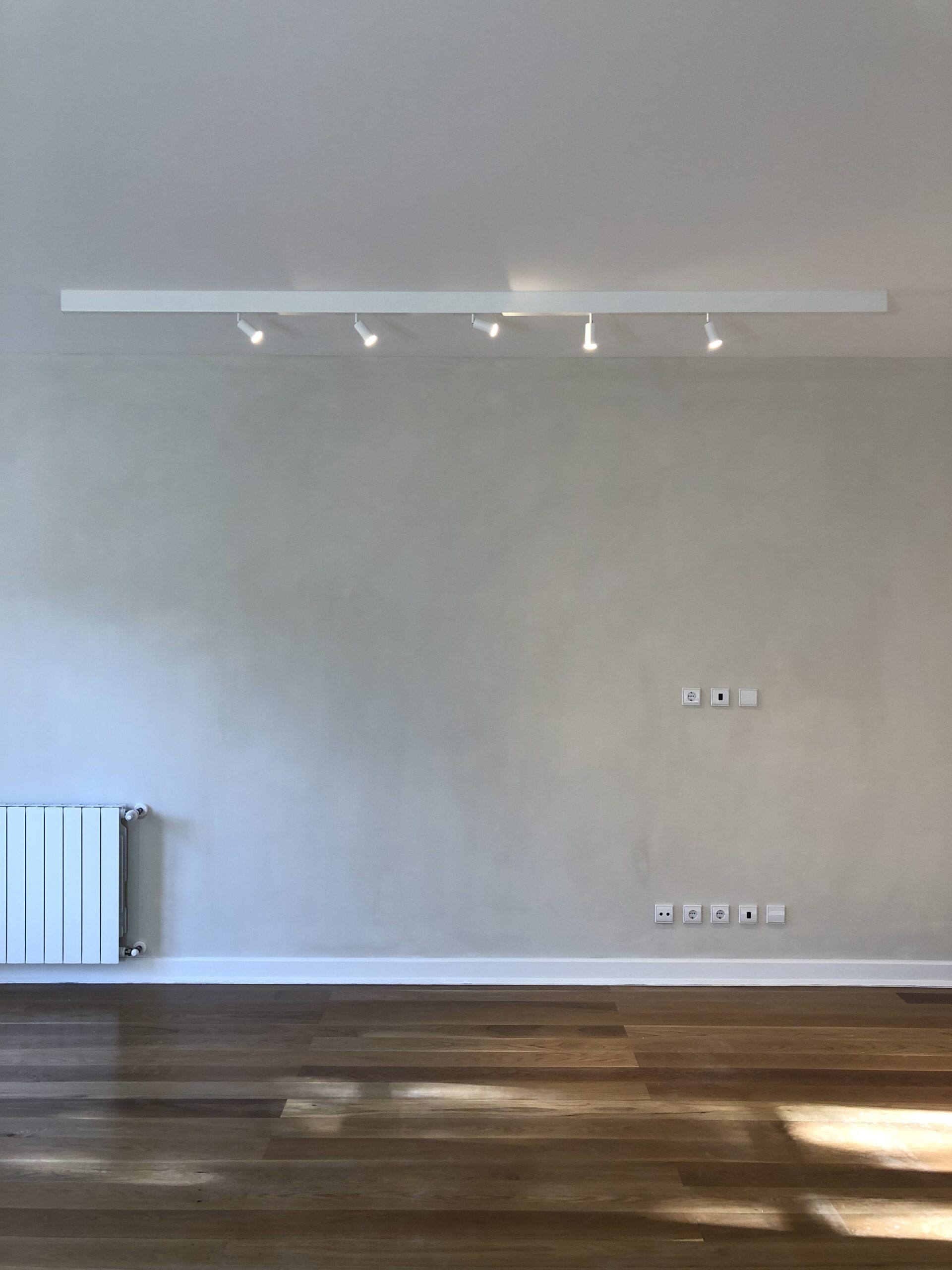 Na sala, o destaque vai para uma calha branca personalizada, discretamente integrada no teto, que alberga cinco spots direcionáveis. Cada foco foi cuidadosamente orientado com uma ligeira aproximação à parede, criando uma luz indireta e aconchegante.
