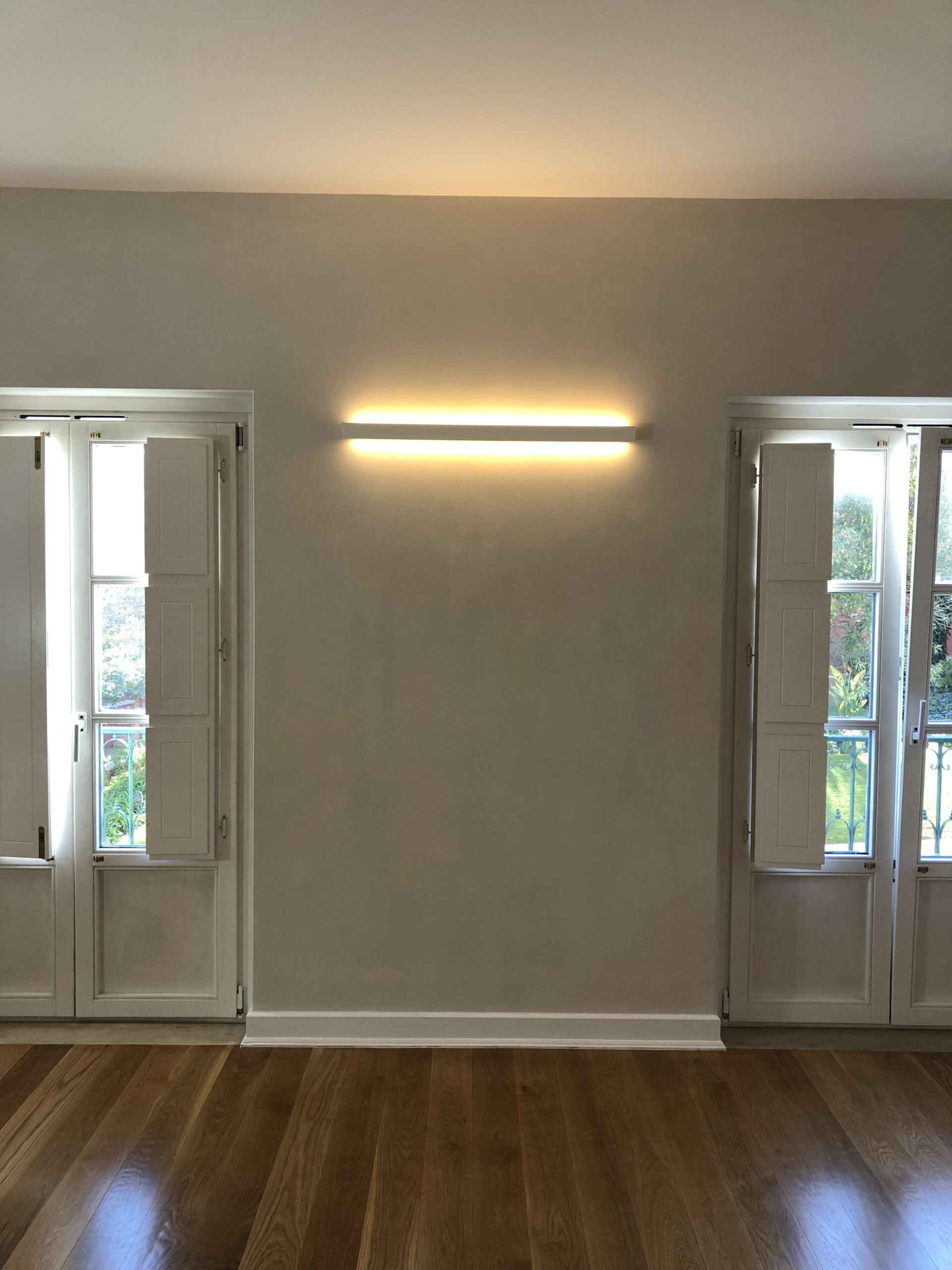 Na parede, o aplique FOSCA complementa o conjunto, projetando uma luz suave, indireta e difusa que reforça o conforto visual e o caráter intimista da sala. Por outro lado, a continuidade luminosa mantém a coerência estética e o equilíbrio entre as diferentes zonas do ambiente.