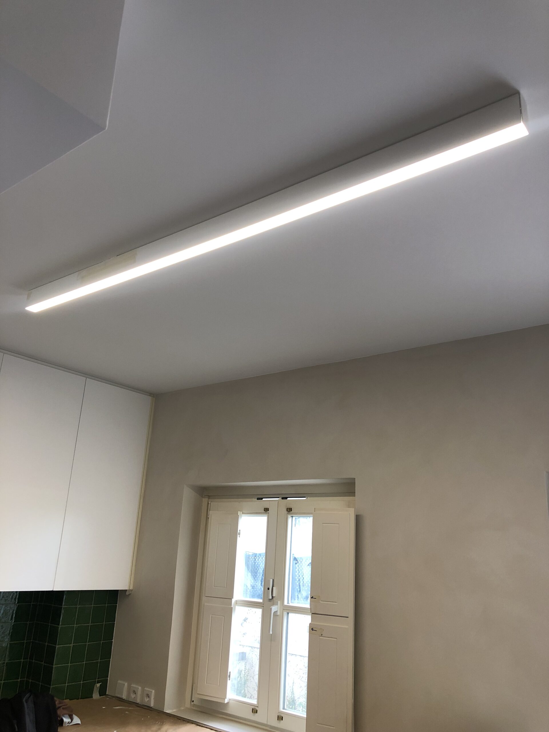 Na cozinha, a escolha recaiu sobre uma calha de superfície Tromilux, também personalizada, ajustada ao comprimento ideal para uma distribuição uniforme da luz.